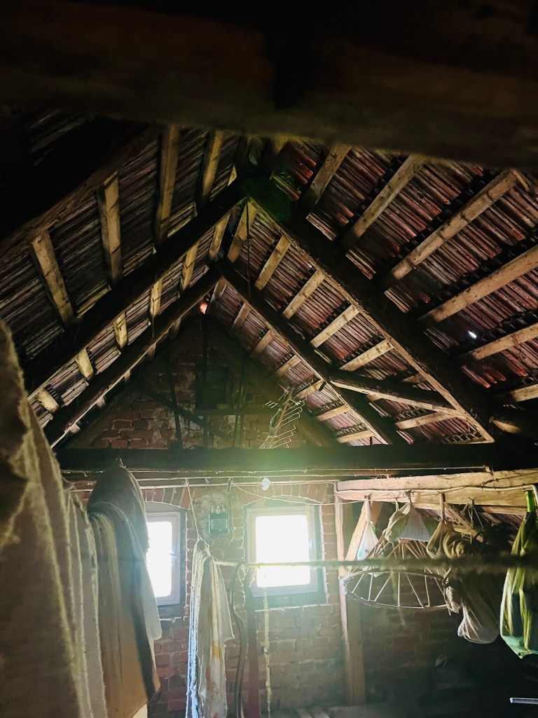 Sprzątanie takiego domu to przygoda sama w sobie. Odbijanie starych płyt, tynków, odsuwanie mebli odsłania historię (np. ściany malowane we wzory wałkiem). Ludzie, którzy sprzedali nam ten dom, wiedzieli w sumie o nim niewiele. Sami byli zaskoczeni, że specjaliści zakładają datę budowy na połowę XVIII wieku. Dom przechodził wiele przebudów i jest trochę jak jajko niespodzianka – nigdy nie wiesz co będzie pod kolejną warstwą . Pod tynkiem na elewacji schowany jest szachulec – co widać na zdjęciach. Być może uda nam się go kiedyś odsłonić. Ściany na parterze między pokojami zrobione są z szachulca, w kuchni są stropy Kleina, a spod desek wychodzi polepa (jak nie wiecie co to jest, to bez lęku, też do niedawna nie wiedziałam